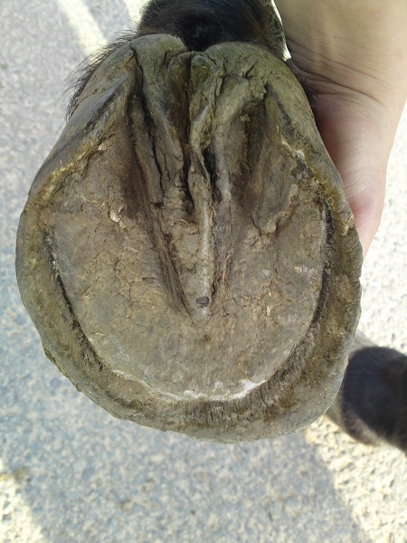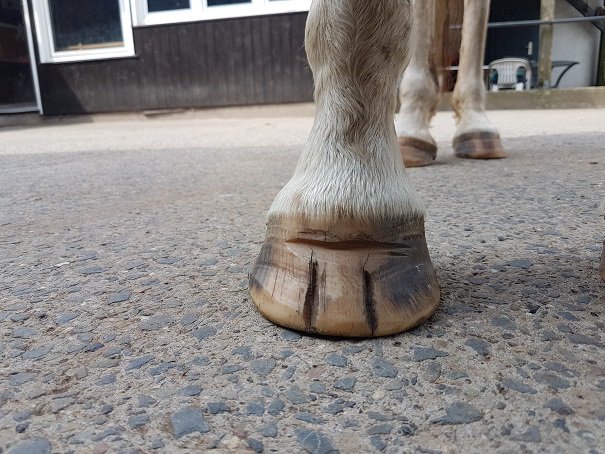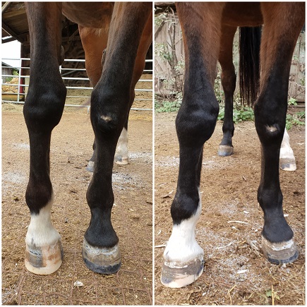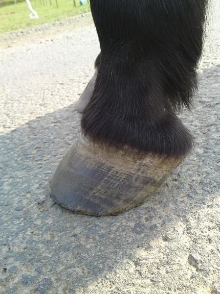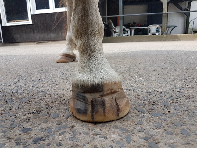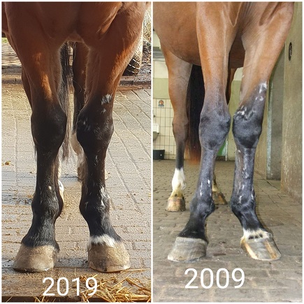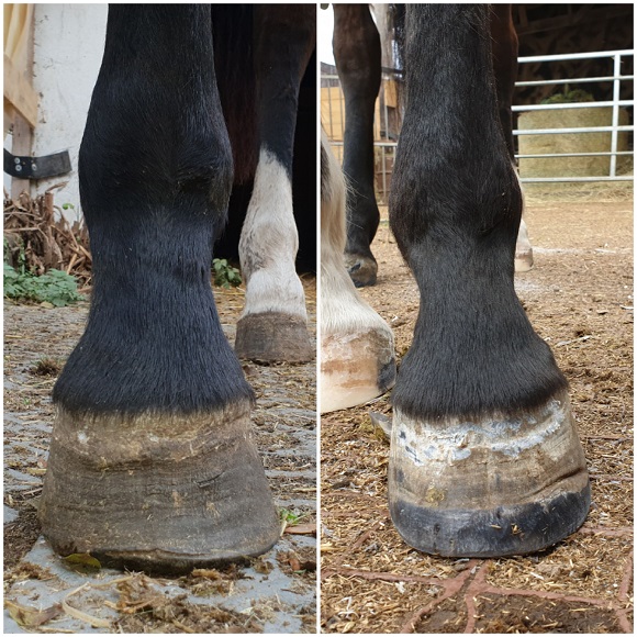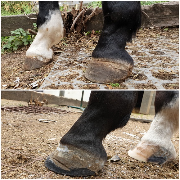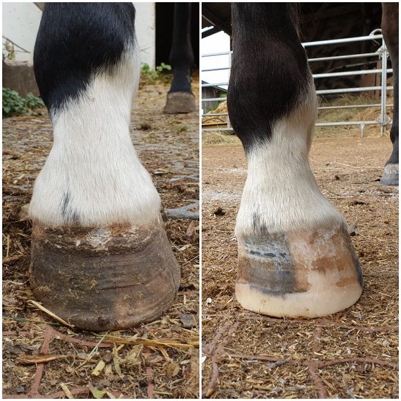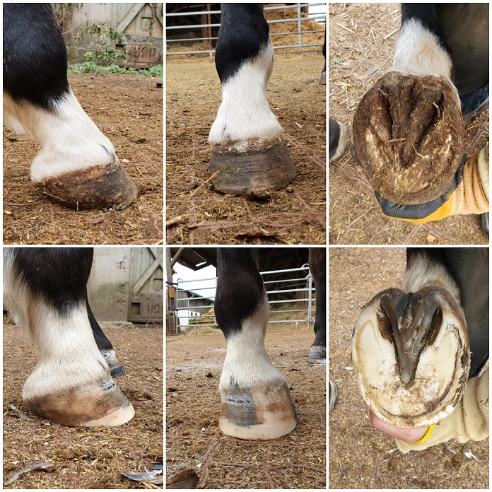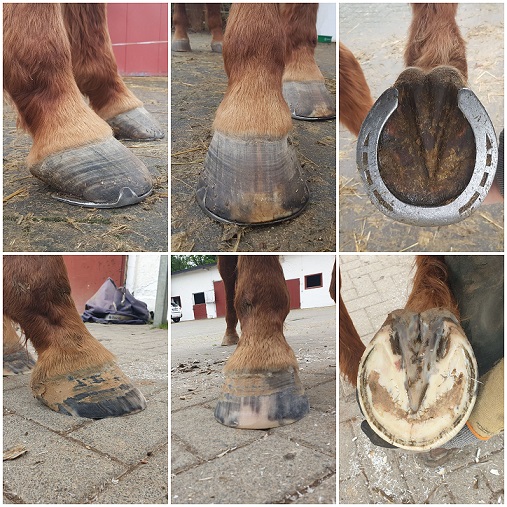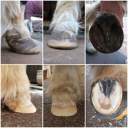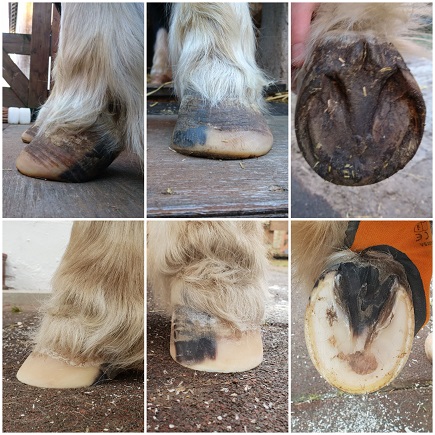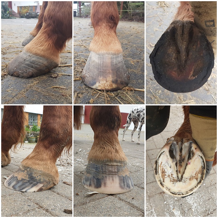 Zwischen den Bildern liegen 1,5 Jahre, die Hufe entwickeln sich langsam aber dennoch gut und in die richtige Richtung. Zum Ausreiten bekommt er vorne Hufschuhe angezogen.