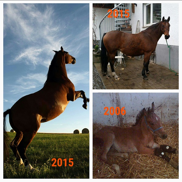 Dream ist meine Warmblut Stute. Ich übernahm sie 2006 im alter von 6 Wochen mit extremen Fehlstellungen der Vordegliedmaßen. Damals war ich noch kein Profi sondt hätte man sicher noch mehr raus holen können. Ich und meine Mutter haben alles erdenkliche getan in zusammenarbeit mit unserem damaligen Hufschmied. Wie das ganze entstand ist nur eine Vermutung. Die Mutter rannte 3 Monate vor der Geburt mit dem Kopf in eine Tierfhängende Astgabel und zog sich eine schwere Wunde am Kopf zu und verfiel in einen Schockzustand. Wir gehen davon aus das das Fohlen danach/ wärenddessen unterversorgt war und sie deshalb mit einer Bänder und Sehenschwäche auf die Welt kam. Sie kam mit den normalen langen etwas krummen Fohlenbeinen zur welt und wurde mit den anderen Fohlen auf die Weide gestellt. Nach ca. 2 Wochen wurde sie leicht X Beinig. Ein Tierarzt wurde Konsultiert und es wurde entschieden noch etwas zu warten. Die Beine wurden schlimmer und der Ta legte im alter von 3-4 Wochen Schienen an die die Beine richten sollten. Hier begann das Problem. Die schienen waren nicht ausreichend Gepolstert. Meine Mutter ( Heilpraktikerin) wurde von einer Freundin angerufen die ihre Pferde in dem Stall stehen hatte. Sie fragte ob sie mal kommen könne und sich das Fohlen anschauen könnte. Sie wüssten nicht ob es durch kommen würde. Wir fuhren also hin und entfernten die Schienen. UNs schlug ein bestialischer Gestank entgegen. Ein gestank von Eiter und Fäule. Unter den Schienen hatte sich das Polstermaterial durchgescheuert... nach nur 4 Tagen. Die Karpalgelenke waren aufgerieben und am Kronrand klafften ebenfalls unschöne Wunden. Wir versorgten zuerst einmal die Wunden und konsultierten den Tierarzt der diese Schienen angelegt hatte. Er selbst war entsetzt und entschuldigte sich mehrfach und gab uns zur Wundheilung diverse Salben. So begann also der "kampf" um das kleine Leben. Ich schlief 3 Wochen meiner Sommerferien im Stall in der Box nebenan, versorgte 2x täglich die Wunden. Nachdem diese grob Verheilt waren begannen wir verschiedene Schienen zu Bauen und unser Hufschmied baute mit und schmiedete uns diverse Ideen. Nach einigen Monaten konnte sie mit den anderen Fohlen wieder auf die Weide. Die Entwicklung der Beine könnt ihr auf den Folgenden Bildern sehen. Seit 2010 wird sie von mir Huforthopädisch betreut und was diese Huforthopädie kann sieht man finde ich sehr eindrucksvoll. Die Stellung hat sich über die Jahre nochmal verbessert. 2008 begann sie leider mit einer Durchtrittigkeit hinten, sie wurde auch Zeitweise mit Eiereisen beschlagen was aber keinerlei verbesserung brachte. Die Stellung und die verfassung der Hufe verschlechterte sich zunehmens. 2016 kam auf ihrem schlimmeren Bein ein Fesselträgerursprungsschaden dazu, das war der Zeitpunkt wo ich sie entgültig in Rente geschickt habe. Sie darf Pferd sein, keiner hätte je gedacht das sie überhaupt 13 wird.